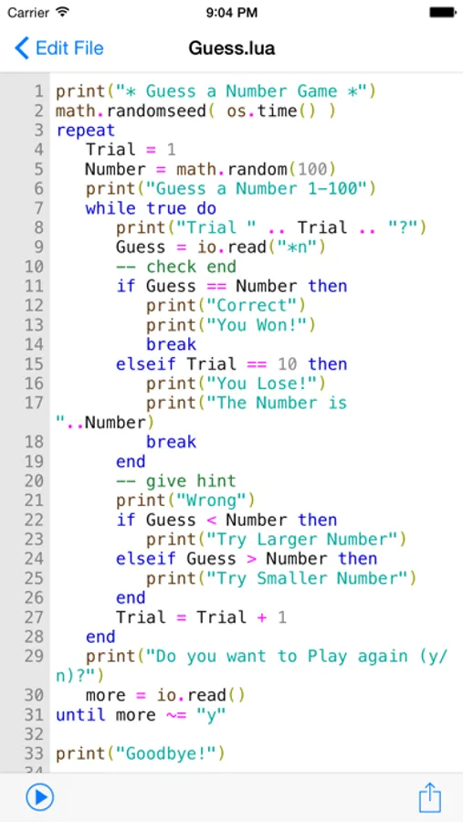 Program with Lua, a simple and modern programming language. Lua’s syntax is simple as BASIC but Lua is faster and more powerful. Which make it just perfect for iPhone platform.