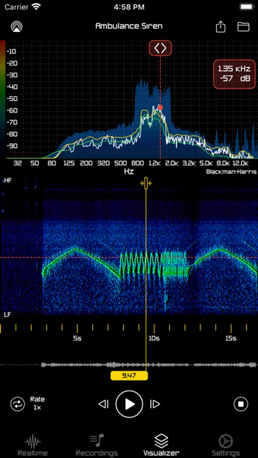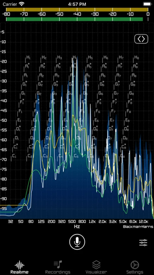 Realtime analyzer gives you the ability to analyze realtime audio input (built-in microphone or external audio accessory inputs) using Fast Fourier Transform with selected window function. You can also record the input for future offline processing or export.