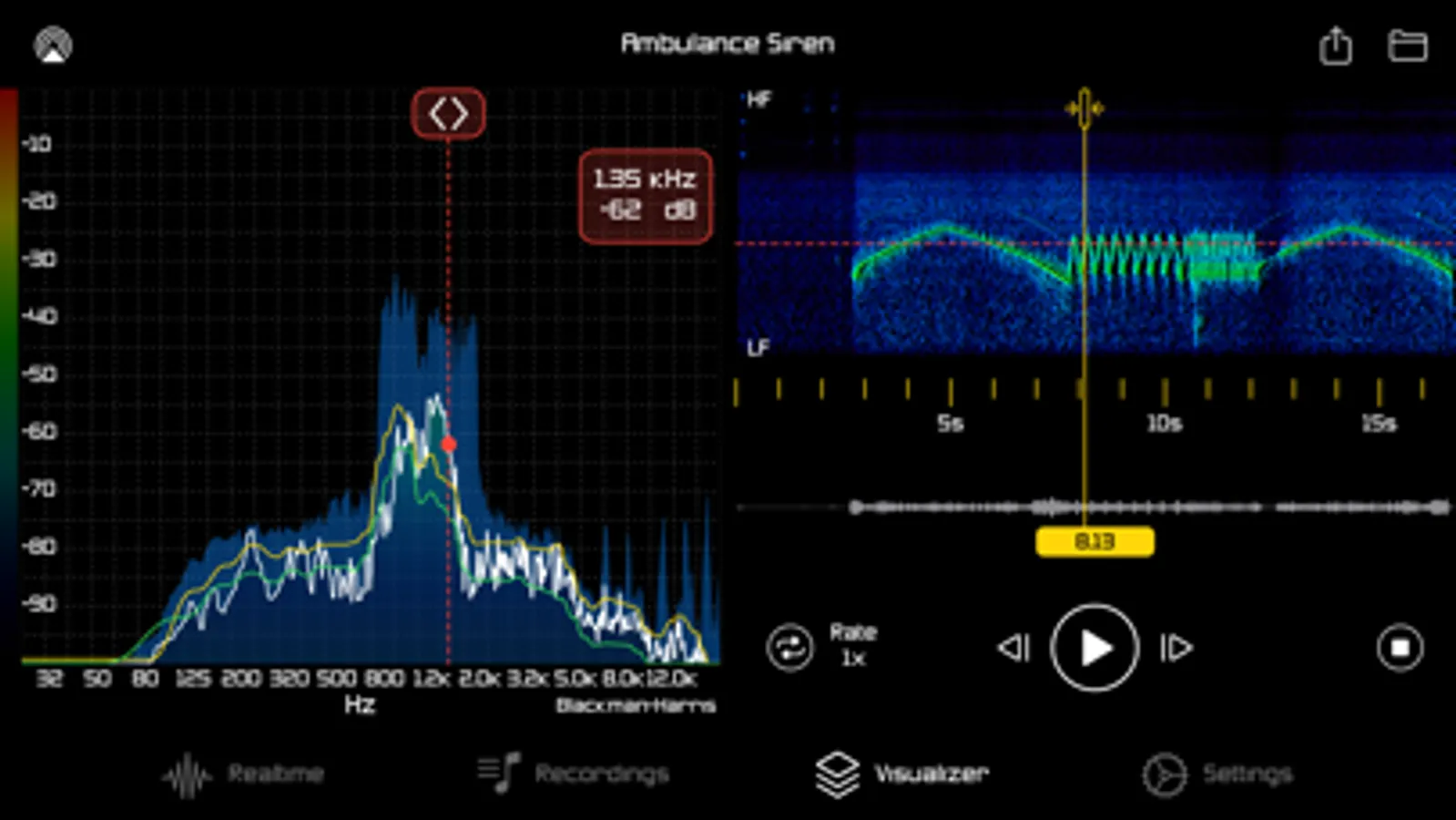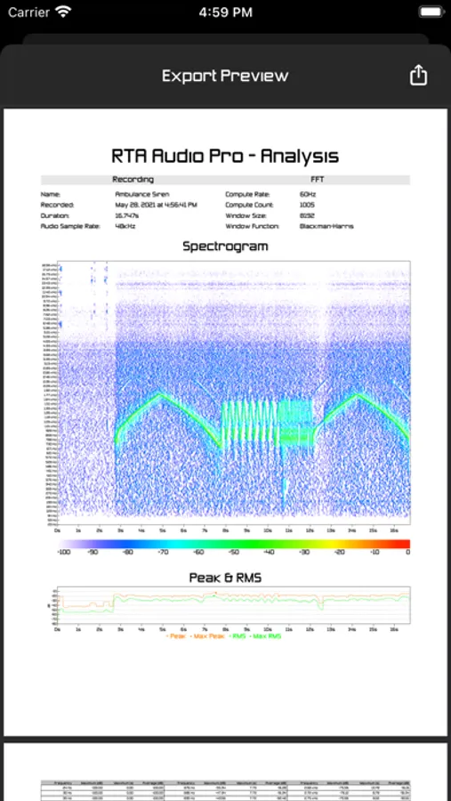 This module presents you the results of offline audio analysis. Selecting previously captured recording gives the graph view, spectrogram and waveform of the audio data. Simple controls gives you the ability to play, loop, seek and change rate of the recording synchronized with analysis data presentation. Export function allows you to share or archive your analysis. Resulting PDF document contains basic recording information, spectrogram, peak & RMS graph and frequency table data with maximum peaks (with the time of the occurrence in recording)