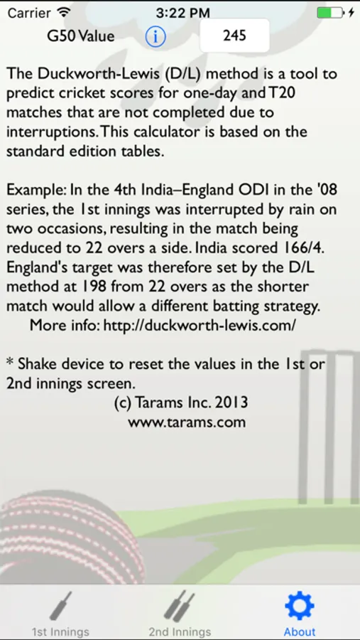 In the sport of cricket, the Duckworth–Lewis method (D/L method) is a mathematical formulation designed to calculate the target score for the team in a one-day cricket and Twenty20 cricket match interrupted by weather or other circumstance. This nifty application calculates the revised scores in such situations by using the Standard Edition D/L tables. You can use this app in your local club games as well as while watching international cricket on the telly.