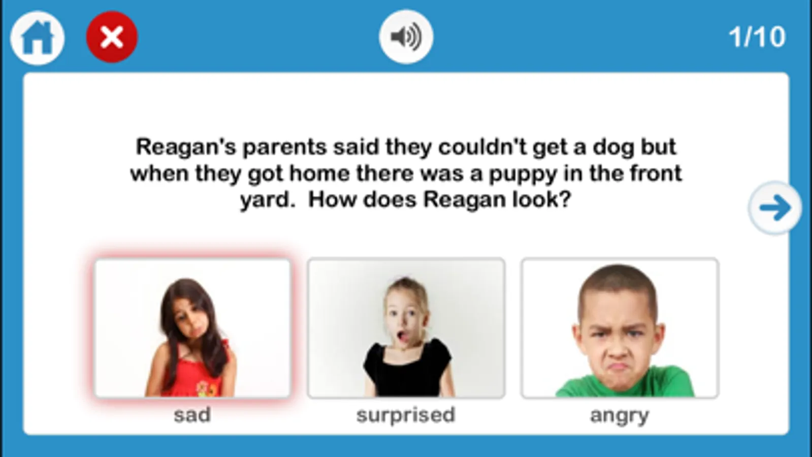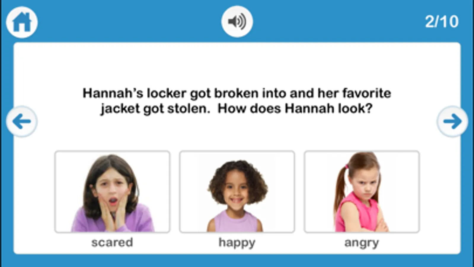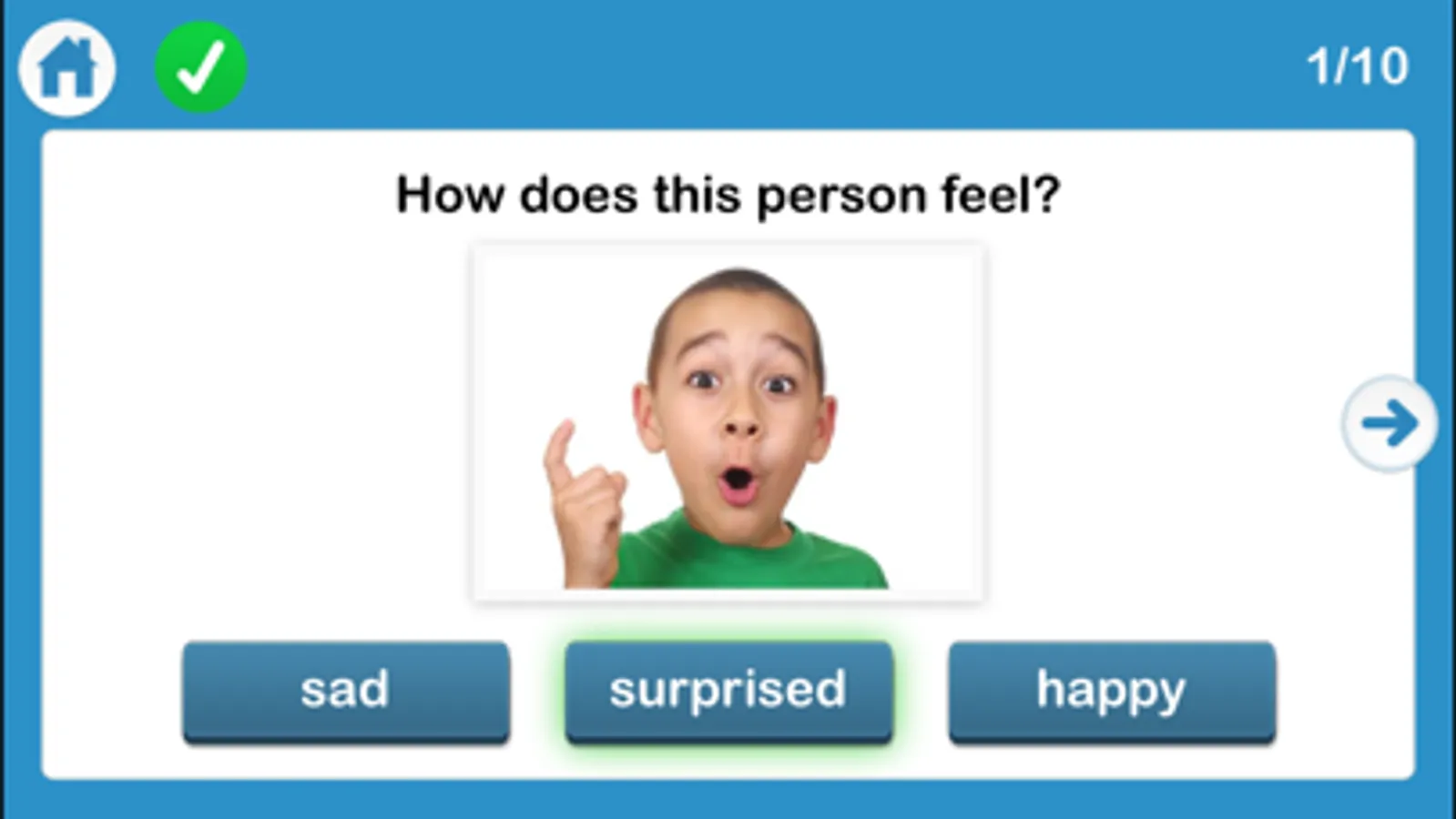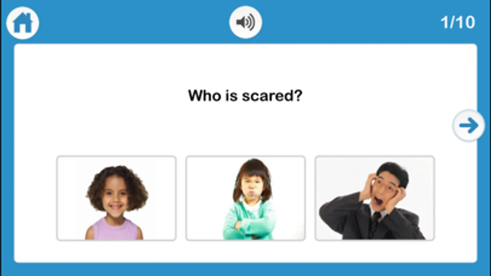 Emotions from I Can Do Apps is an educational tool designed in collaboration with a Speech Language Pathologist that allows you to introduce new concepts, practice identifying emotions, taking perspective / theory of mind, in a fun and simple way. This app focuses on helping individuals identify different facial expressions using real faces and test their understanding of emotions. Emotions include - happy, sad, scared, surprised and angry.