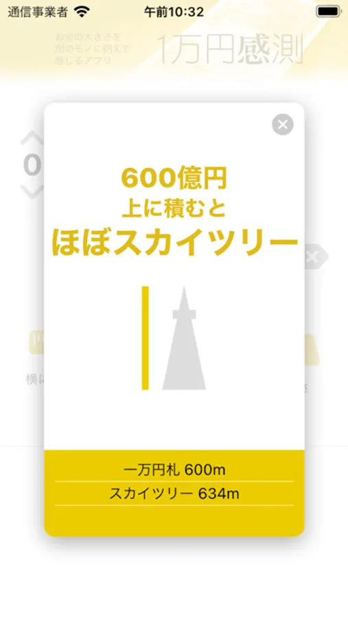 例えば「600億円の札束を積み上げるとスカイツリーとほぼ同じ高さ」といったように、1万円札の量を別のものに例え、イラストと共に表示します。