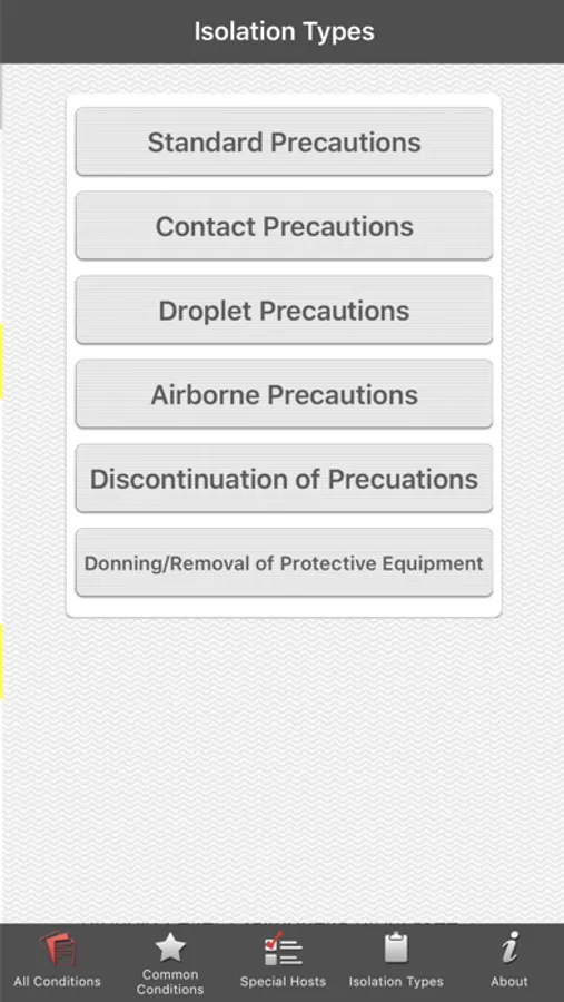 About us: This application was developed by Amaran Moodley and Richard Lee in collaboration with Hipposoft, LLC at the University of California, San Diego. The application incorporates guidelines from the 2007 “Guideline for Isolation Precautions: preventing transmission of infectious agents in healthcare settings”. This material was used with permission from the Healthcare Infection Control Practices Advisory Committee of the Centers for Disease Control (CDC). Additional information was obtained from American Academy of Pediatrics Red Book 2009. Information on cystic fibrosis was obtained from the 2003 Cystic Fibrosis Foundation Guideline, “Infection Control Recommendations for patients with cystic fibrosis: microbiology, important pathogens, and infection control practices to prevent patient to patient transmission”.