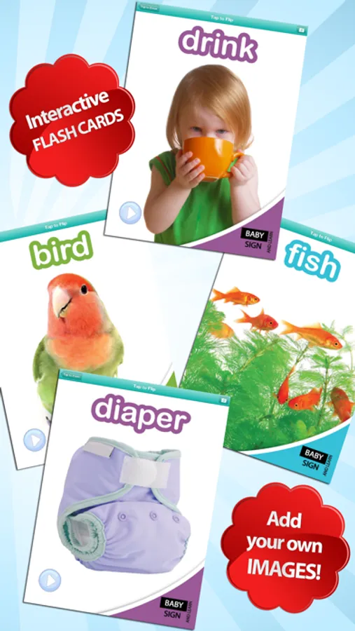 Baby Sign and Learn (ASL Pro Edition) features cute animated video demonstrations that will captive your child. Practice by playing the fun interactive quiz and inspire your baby to sign with the aid of the colorful flashcards.