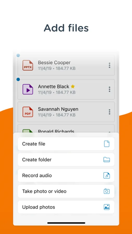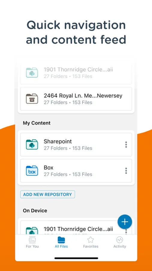 Need something new? Easily add new documents, media, folders or connect to a new repository by tapping the plus in bottom right of the app.
