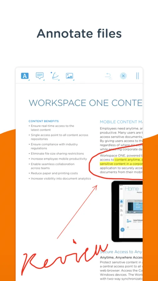 Workspace ONE Content brings you secure access to all of your files anytime, anywhere, across your devices. Easily share files, mark files as favorites, access documents offline, edit Office documents and annotate PDF files with built-in editing tools.