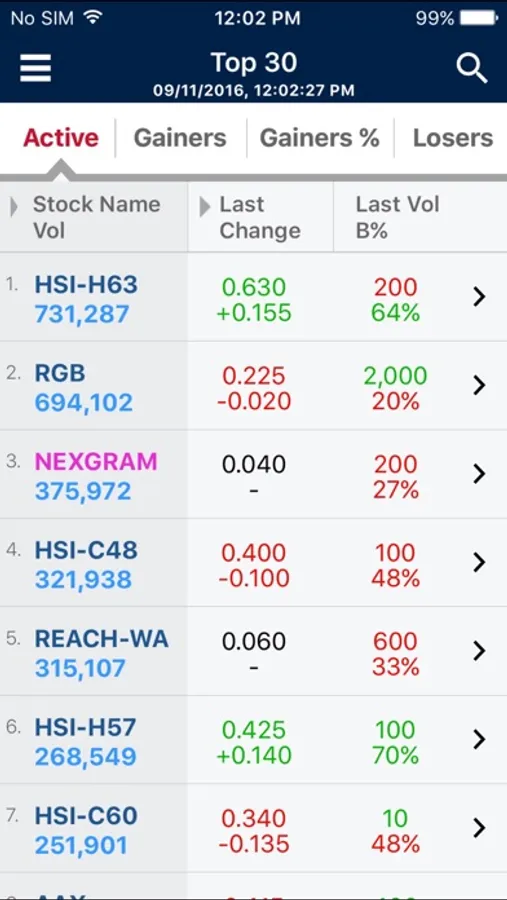 - Top 30 on Most Active, Top Gainers, Top Losers stock listing