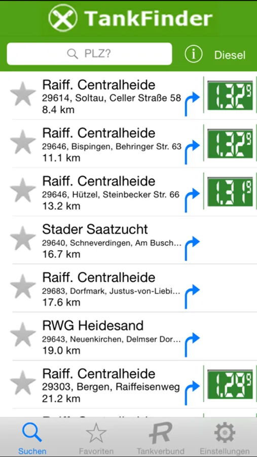 Die Ergebnisse werden übersichtlich in einer Liste angezeigt. In der Listenansicht sehen Sie bereits die aktuellen Preise von Diesel und Super Bleifrei (wenn vorhanden).