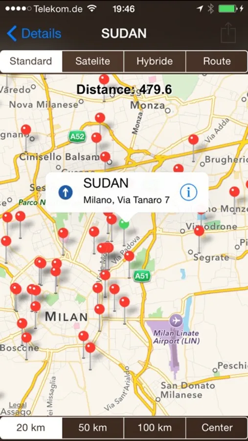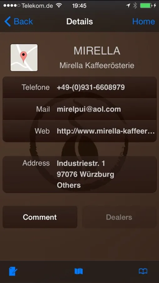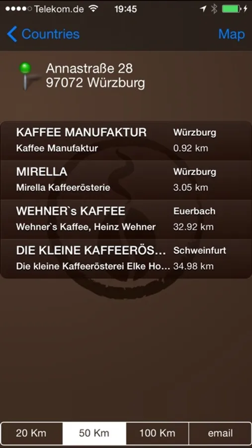 With the surround-search the app finds roasters round the current position (25 / 50 / 100 km radius) - first as a list, and if you wish also as a map (this might produce additional costs in foreign countries, depending on your provider - the app informs you also about this possibility). Perfect, if you need coffee beans during your travel. and for coffee-junkies it would be annoying to miss a roastery on your trip…