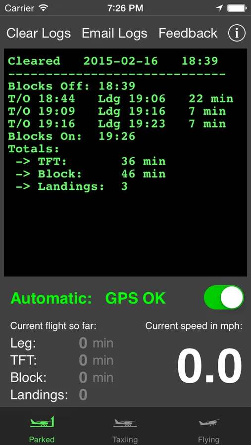 Over at the airport restaurant, tap on parked and see all the information you need to fill out your logbook. Yes, the restaurant is optional, but you need to press parked before you drive away from the airport, so the app can figure out your correct block-on/end time.