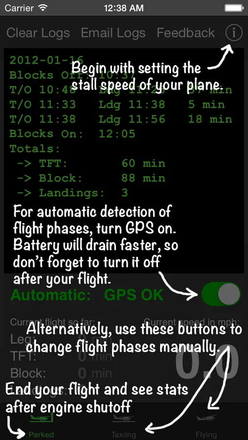 All you have to do is enter your plane's stall speed so that the app knows whether you are flying a Citabria or an F-16 and turn GPS on before your flight.