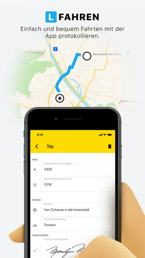 + Die gespeicherten Daten sowie der Fortschrittstatus können jederzeit eingesehen werden. Die an der Ausbildungsfahrt beteiligten Personen (Bewerber/Begleitperson) können direkt am Smartphone unterschreiben. Am Ende kann ein L17-Fahrtenprotokoll ausgedruckt werden. Das Fahrtenbuch beziehungsweise Fahrtenprotokoll ist streng nach den gesetzlichen Vorgaben gestaltet.