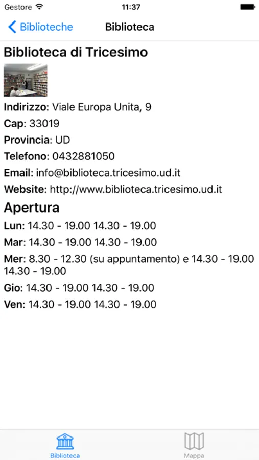 Puoi visualizzare l'immagine della tua biblioteca, accedere ai dati di contatto (telefoni, e-mail, sito web) e consultare l'orario di apertura.