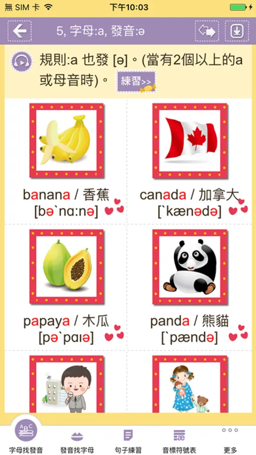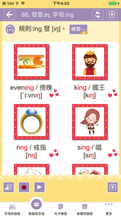 由發音找出對應的字母 (組合) 和常用單字,並說明各種特殊發音規則。