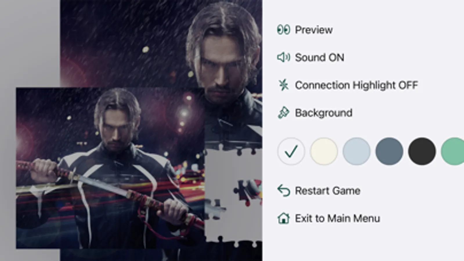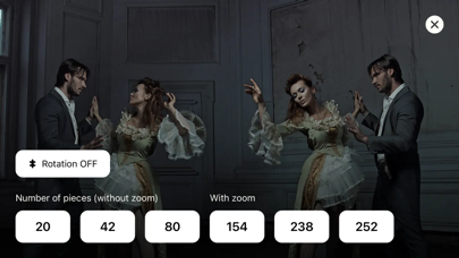 - 8 levels of complexity: from 20 pieces up to 1110 pieces, available for any puzzle;