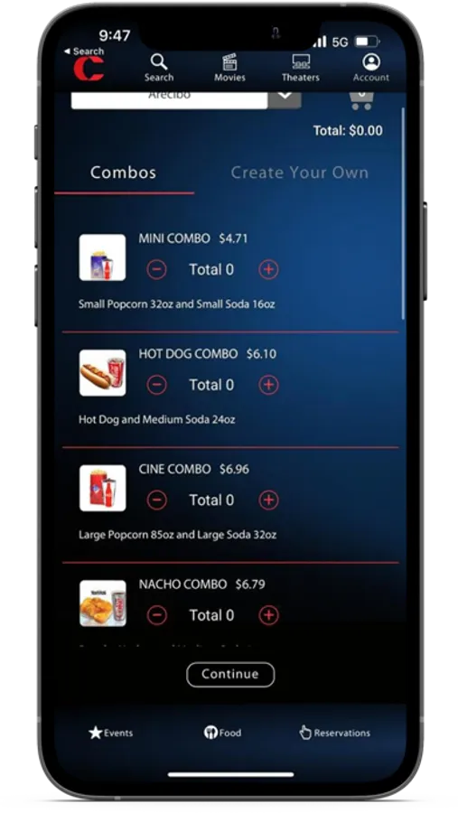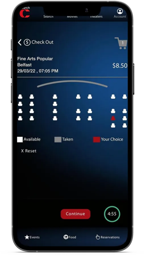 Food & Concessions: Include your concessions in advance, and save time at the theater! Note: all items available ‘in store’ are not yet available ‘in app’