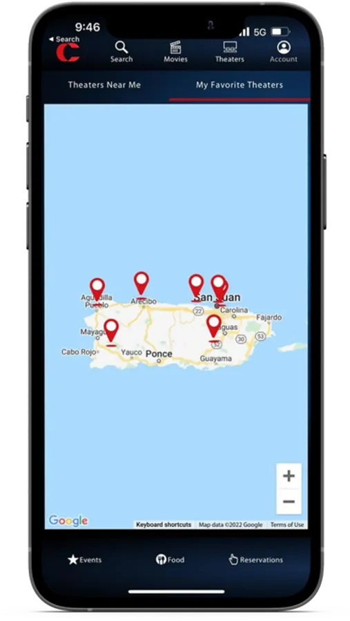 Theaters: links with Google Maps to show you the closest theaters. You can also keep track of your favorite locations.