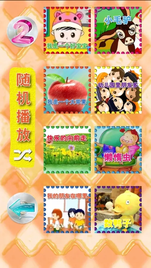 碟2:我是一个好宝宝,小毛驴,我是一个大苹果,幼儿园里朋友多,快乐的向前走,懒惰虫,我的朋友在哪里,数鸭子