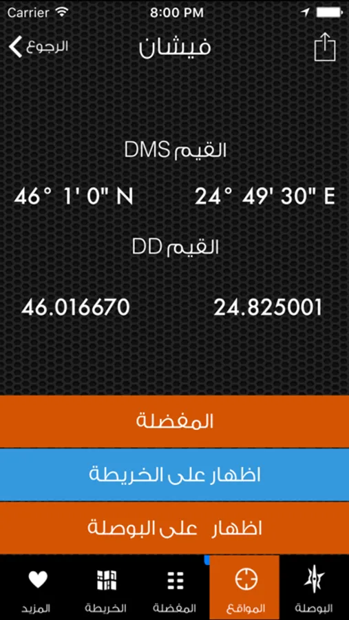 مشاركة الاحداثية باكثر من صيغة عن طريق الرسائل او تويتر او الفيس بوك او الايميل