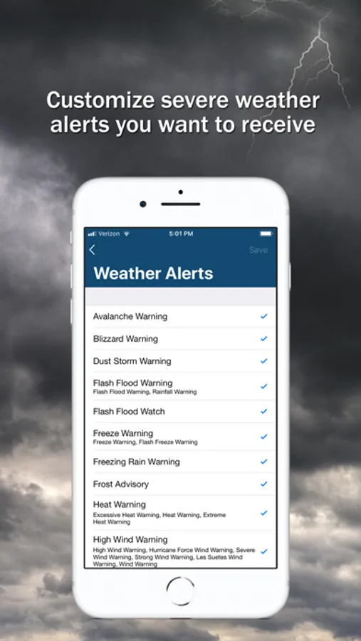 • Get voice alerts just like a NOAA weather radio via push notification anywhere in the United States.