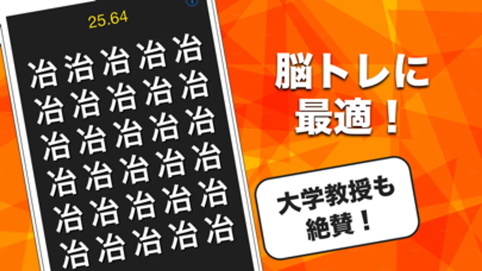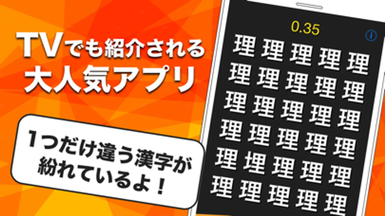 ルールは簡単!制限時間30秒以内に、並んでいる漢字の中からひとつだけ異なる漢字を見つけ出そう。通勤・通学時間に、ちょっとした暇つぶしに、スマホひとつで手軽にアハ体験!