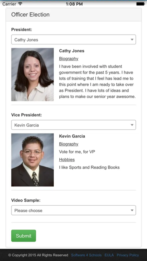 Description – Run your school student body elections online. In a few clicks you can create a school wide election with no need for paper ballots or Scantrons. Students can vote from home, school computer lab or, best of all, their smart phones! Results are instant and students are limited to only vote once per election. Schools can create unlimited elections, display student pictures, student biography and customize the look and feel to match the school site.