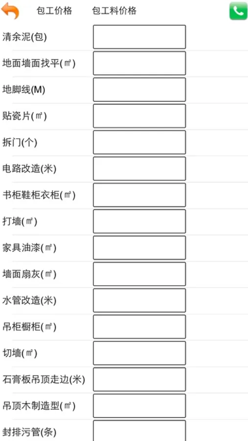 可以输入要装修的面积各项装修内容自动计算总价格。