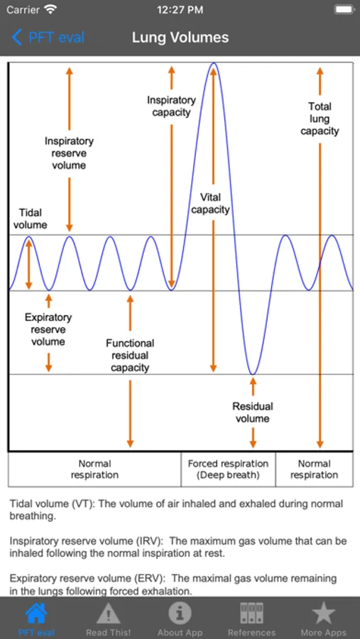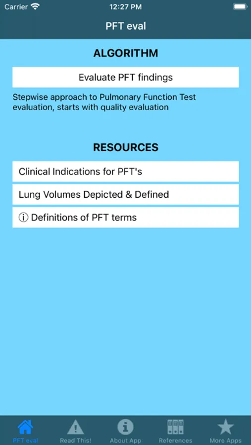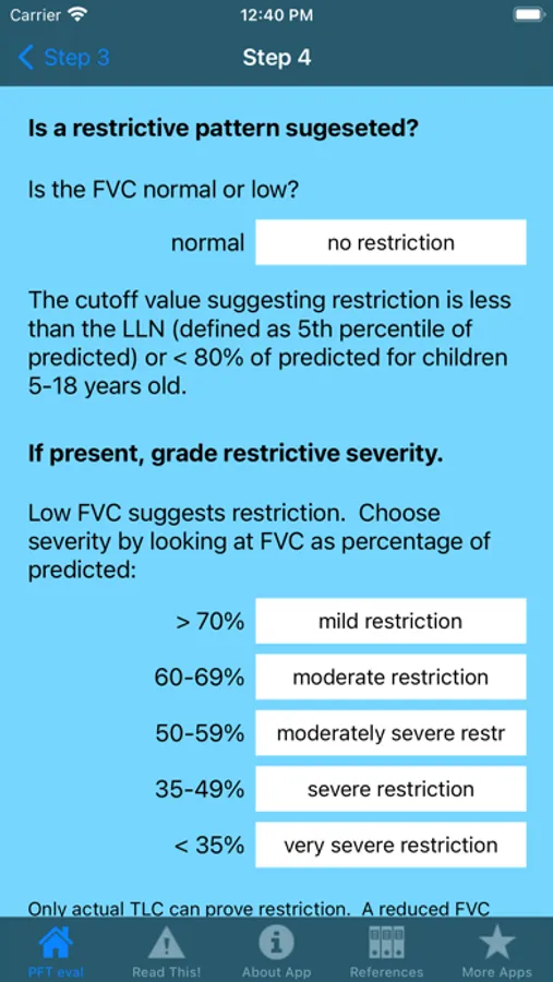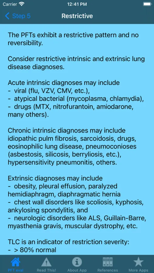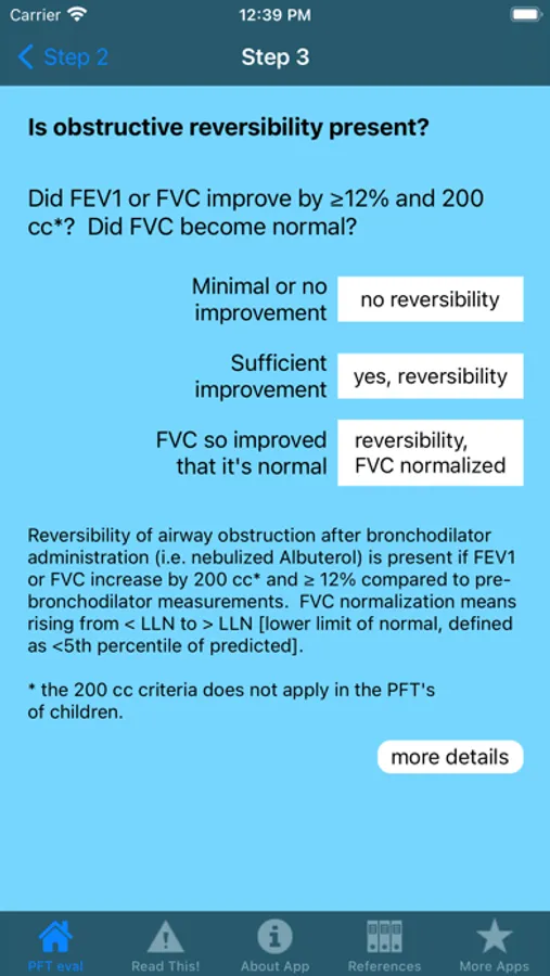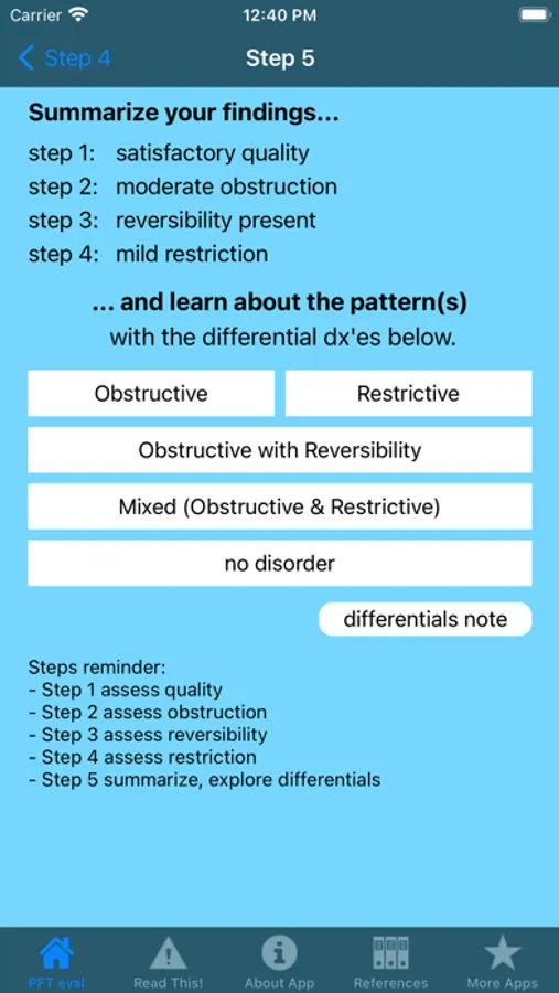 PFT eval walks a clinician through a quick simple stepwise approach to analyse Pulmonary Function Tests (PFT's) in order to arrive at ventilation and respiration disorders and diagnostic ideas about patients. It is based upon several evaluation protocols in the medical literature. This tool not only yields answers, but just as importantly teaches the stepwise thinking process to arrive at answers along the way. A clinician or learner will wind up with good information that assists patient care and should wind up a little smarter and more able to do it with less assistance the next time. It is a great support for those of us clinicians who use these tests only occasionally and don't have it memorized. The differential diagnoses are then offered for the various findings of obstructive patterns, restrictive patterns, airway obstruction reversibility, etc.