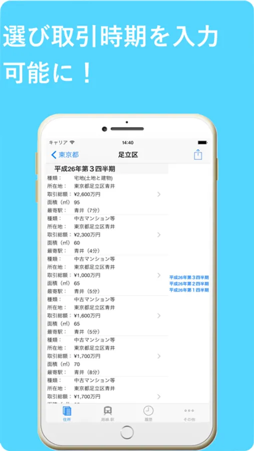 1) Because the total data is very very large(more than 1200000 records), please specify the municipality from the top address screen then download the real estate transaction data you want to search into your device.