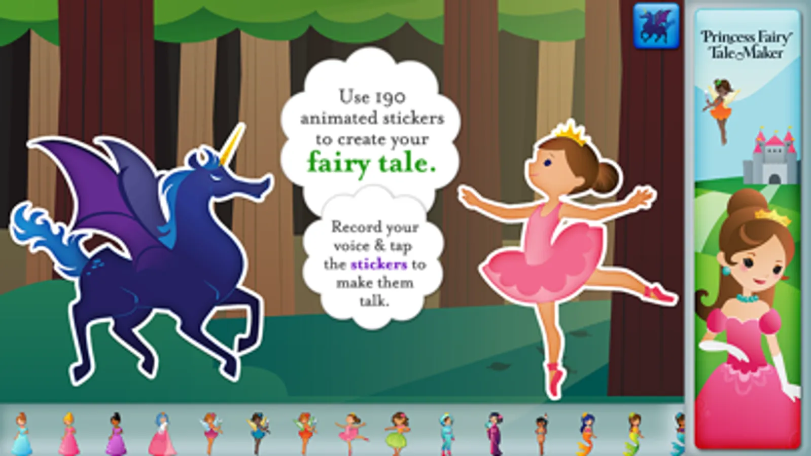 - 190+ animated stickers: princesses, hula girls, fairies, ballerinas, animals, flowers, food and more