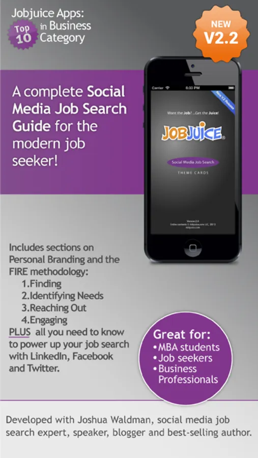 The Jobjuice Social Media Job Search App was developed in partnership with Joshua Waldman, Social Media expert, speaker, blogger and best-selling author.