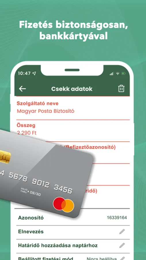 Az alkalmazás segítségével internetes fizetésre alkalmas bankkártyájának használatával befizetheti csekkjeit, elektronikus és papír alapú számláit, vagy feltöltheti mobiltelefon egyenlegét is.
