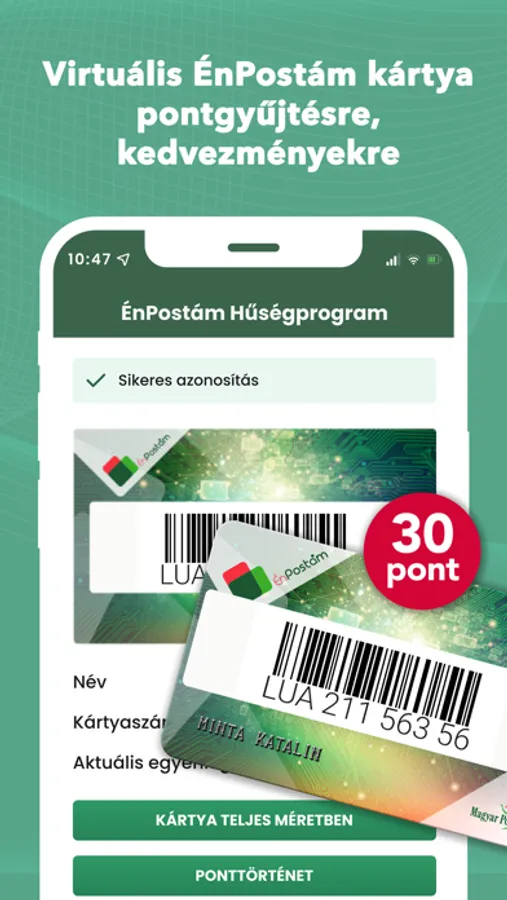 Az ÉnPostám Hűségkártyája azonosítóját (LÜA) már a kártya vonalkódjának a beolvasásával is megteheti, valamint hűségkártya azonosítást követően az alkalmazásban megjelenik a virtuális hűségkártyája, lekérdezheti pontegyenlegét és ponttörténetét, emellett megtekintheti az aktuális kedvezményeket.