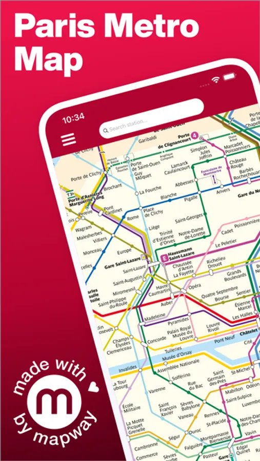 Paris metro map within an interactive transport app. Paris Metro is the best navigation tool for travelling around the French capital with offline routing, train times and lots of essential journey information.