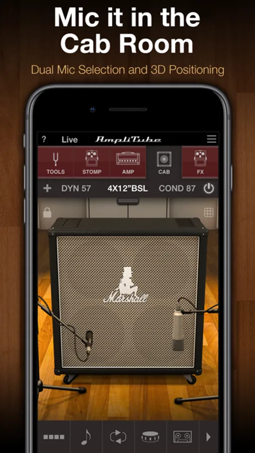 Thanks to AmpliTube's Cab Room, you’ll feel like you are in your own professional recording studio. Mic your cabinets in full 3D in a beautifully rendered virtual studio environment with 2 iconic guitar mics (expandable to 16 mic models available via in-app purchase).