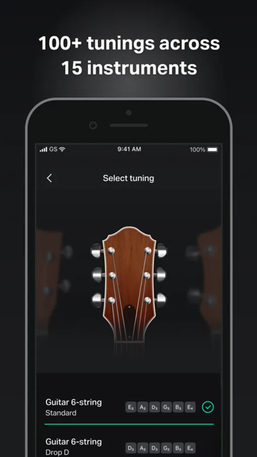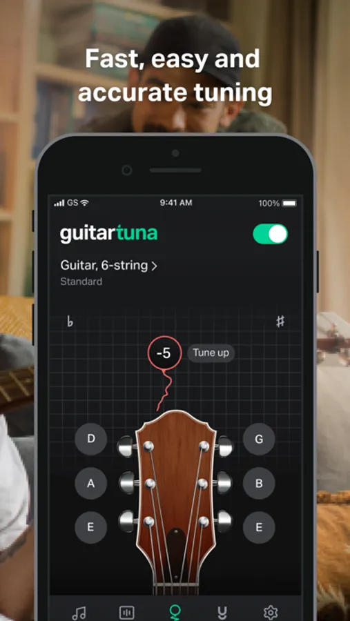 • Just pluck a string on your instrument and GuitarTuna detects the sound using your device’s microphone.