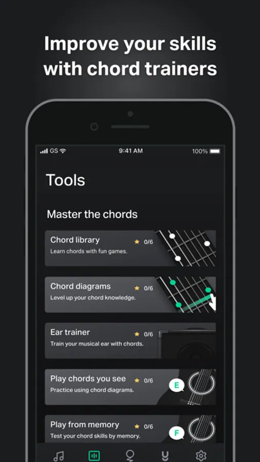 • Practice tools: Ear training, chord library, games, and trainers