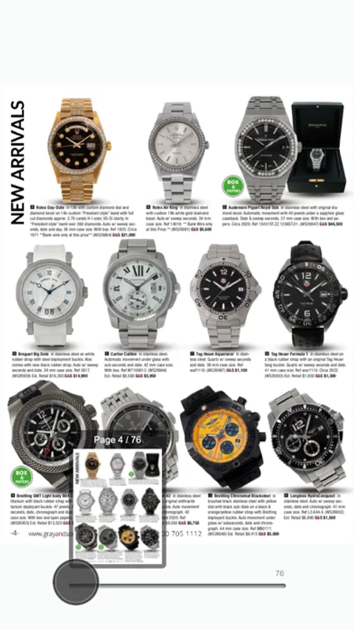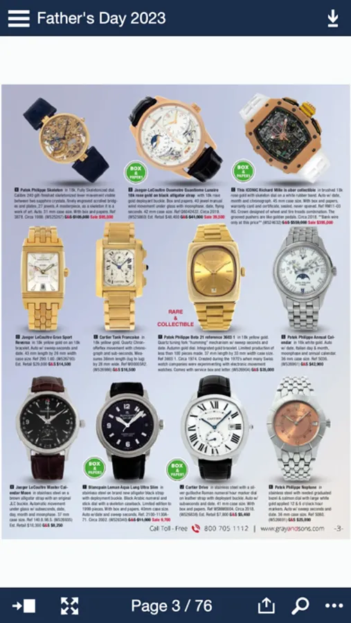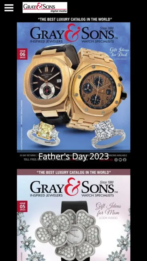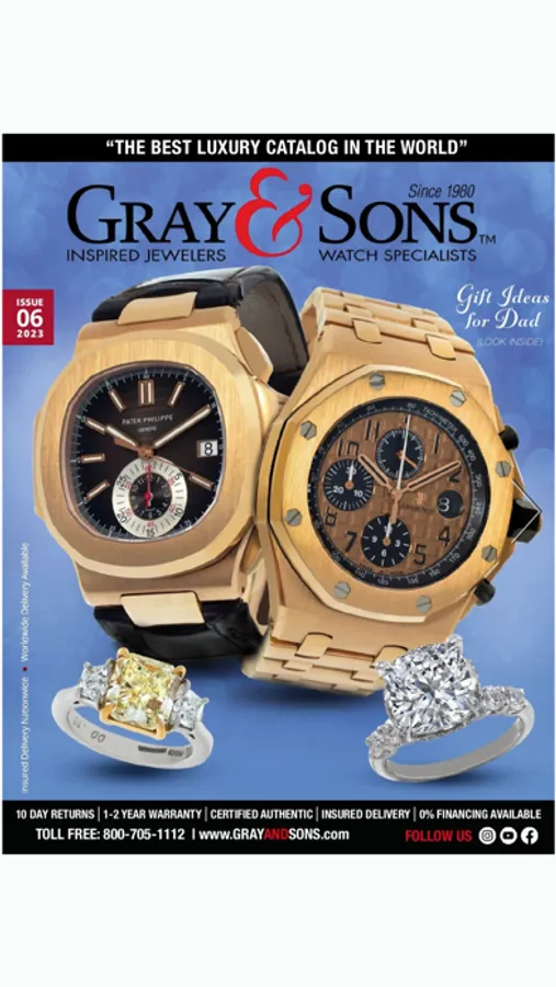 Browse the Gray & Sons Catalog Digital Edition. Gray & Sons Jewelers has specialized in buying, selling and repairing fine pre-owned watches and estate jewelry since 1980. This catalog offers the best watch brands in the world for a substantial discount (up to 70% off new retail list price). Names like Rolex, Cartier, Patek Philippe, Audermars Piguet, Omega, IWC and more. Also fine gold and platinum jewelry (both modern and vintage) and GIA certified diamonds. Get the best for less – much less! This is the only monthly catalog of its kind!