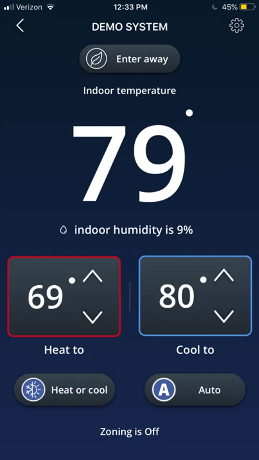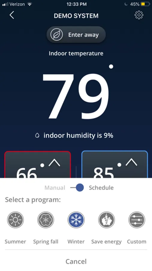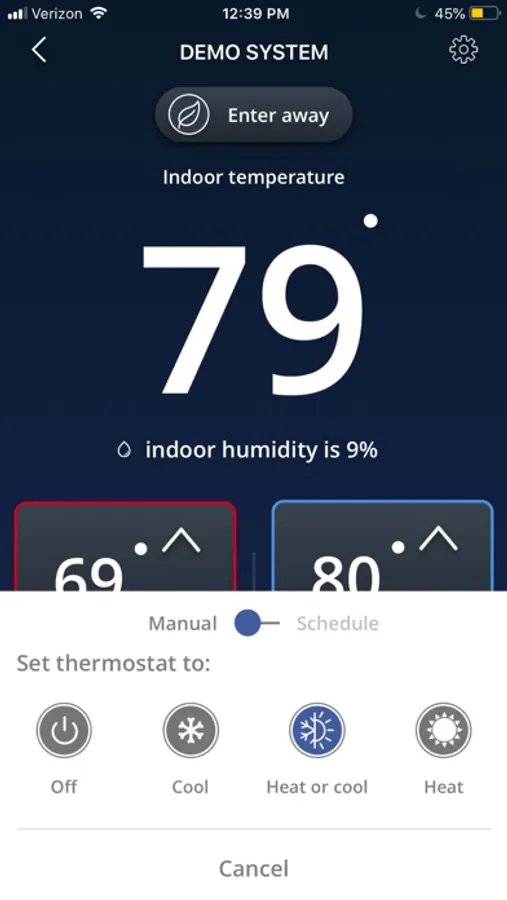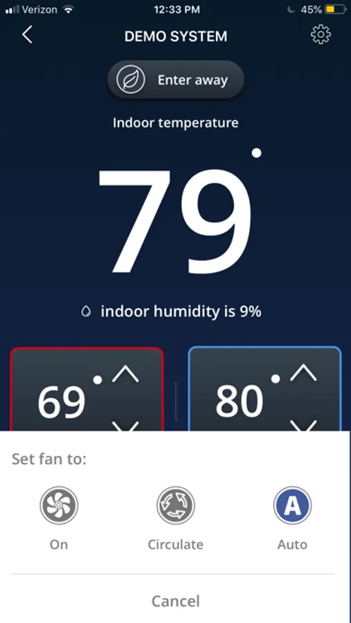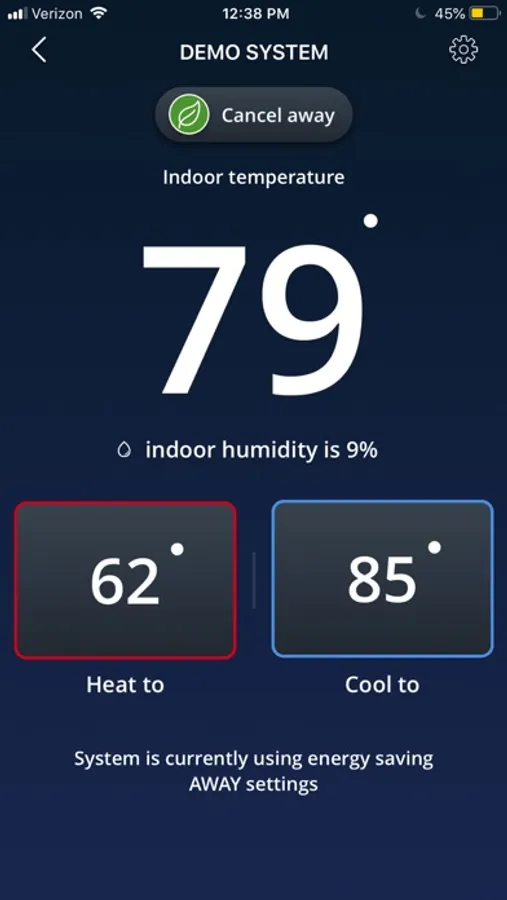 Leave the house and forget to dial back the thermostat? Simply start the app and use the one- touch away mode to save energy the entire time you are gone. Cancel the away mode before you get back to return to a perfectly comfortable home.