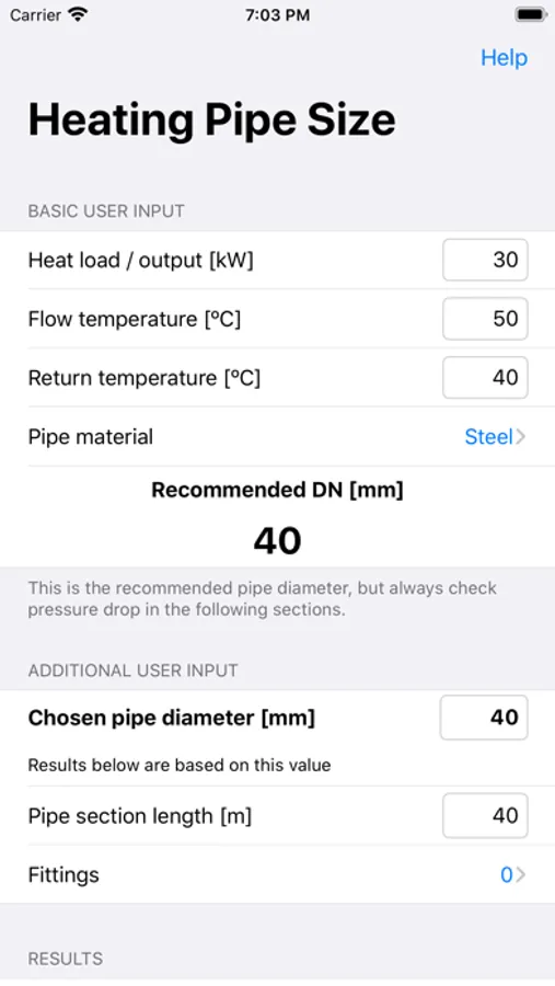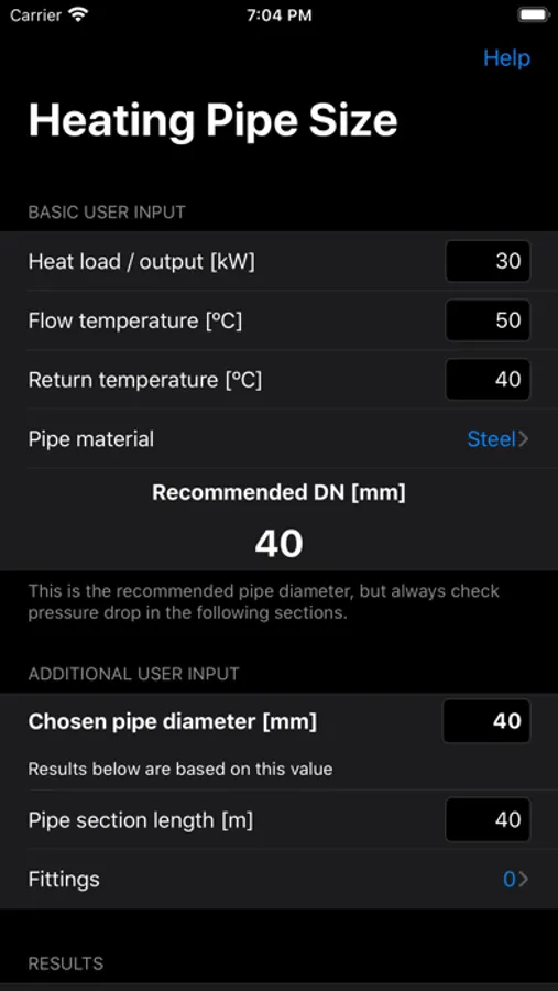 Enter the required heating or cooling output and water flow and return temperatures. Choose pipe material. The recommended pipe diameter is already there, presented as a standard DN.