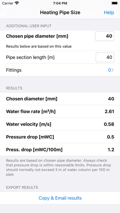 Estimate required pipe diameter of a closed hydronic heating or cooling system in an instant and calculate pressure drop to determine required circulation pump characteristics (flow and head). Easy to use, quick and accurate results.