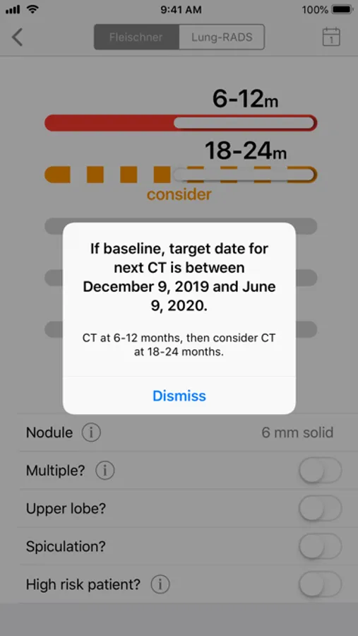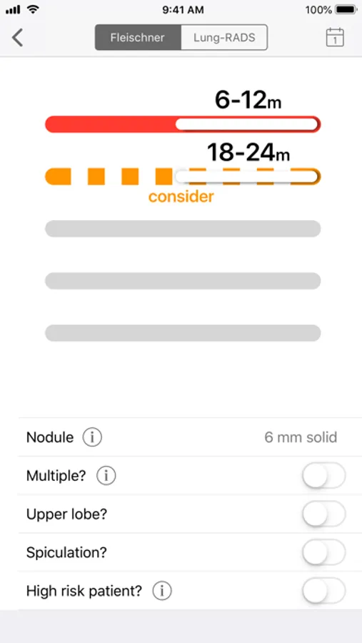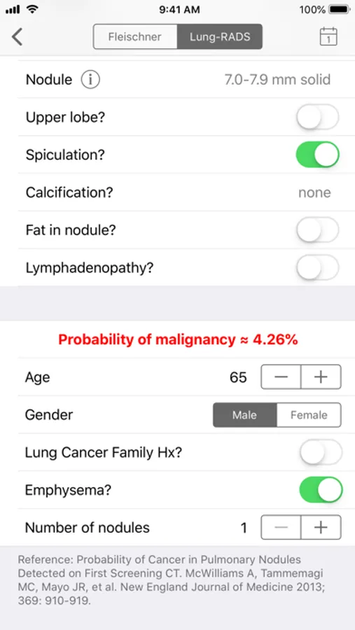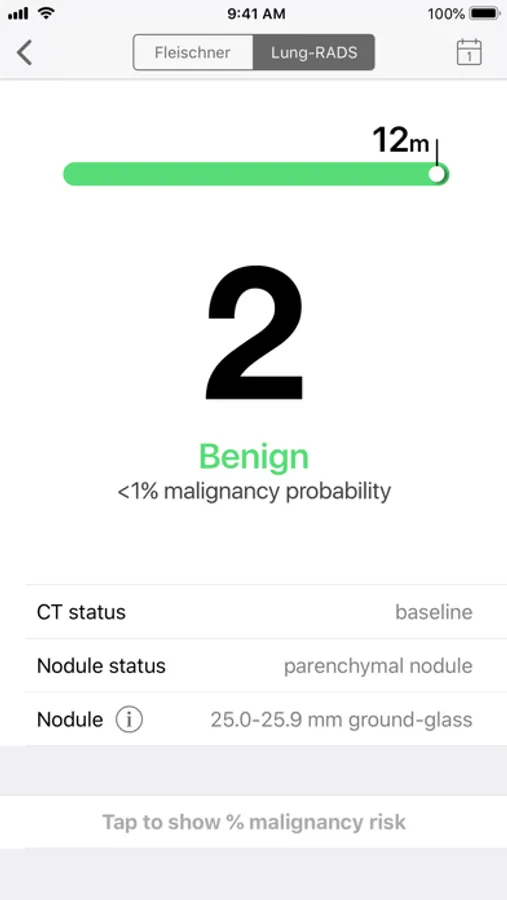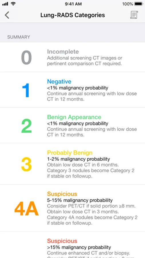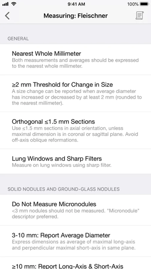 The most current versions of these guidelines for managing incidentally discovered lung nodules and lung nodules discovered during lung screening are elegantly integrated in this app, in addition to a convenient tool to estimate the malignancy risk for any lung nodule.