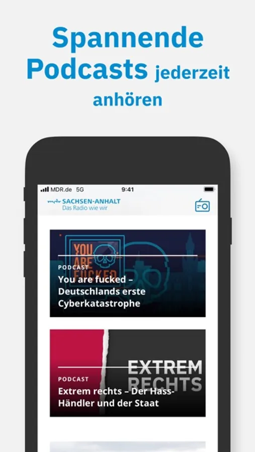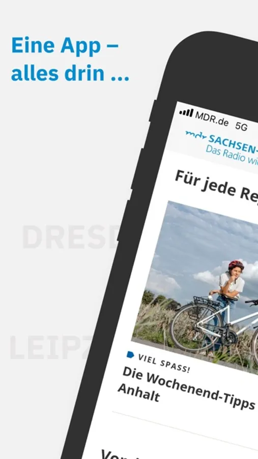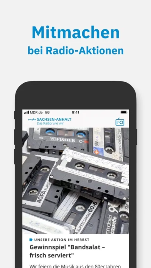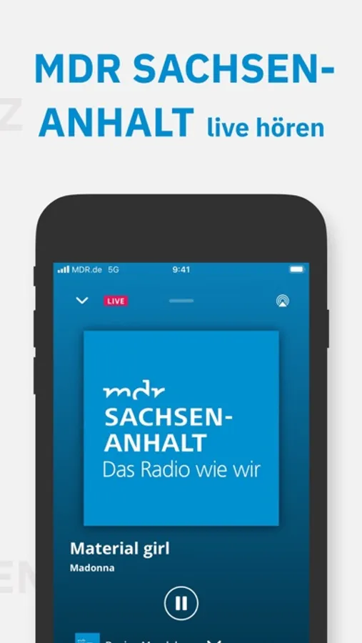 • Radio: Wir liefern täglich im Livestream „MDR SACHSEN-ANHALT – Das Radio wie wir“ direkt auf Ihr Smartphone. Wählen Sie zwischen den Regionen Halle, Magdeburg, Dessau und Stendal aus, oder lassen Sie sich von unserer Schlagerwelt inspirieren. Natürlich inklusive Titelliste.