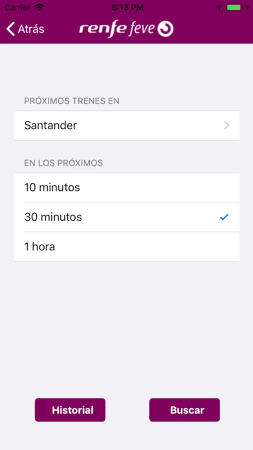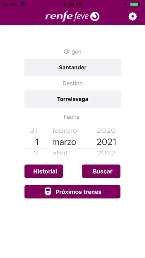 La consulta se realiza seleccionando origen/destino y fecha. Dispone de un histórico de consultas.
