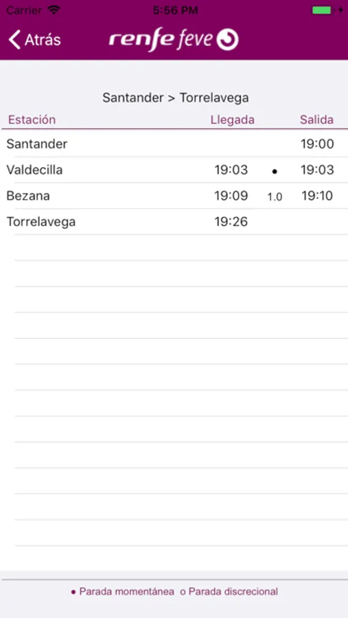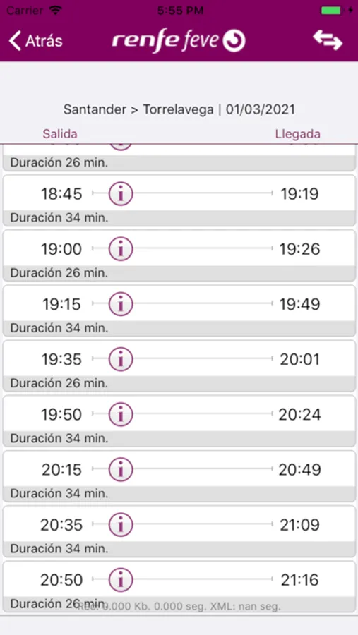 En los resultados obtenidos se informa de los transbordos a realizar. Para cada tren se puede obtener los datos de todas sus paradas seleccionando la opción de información (i).