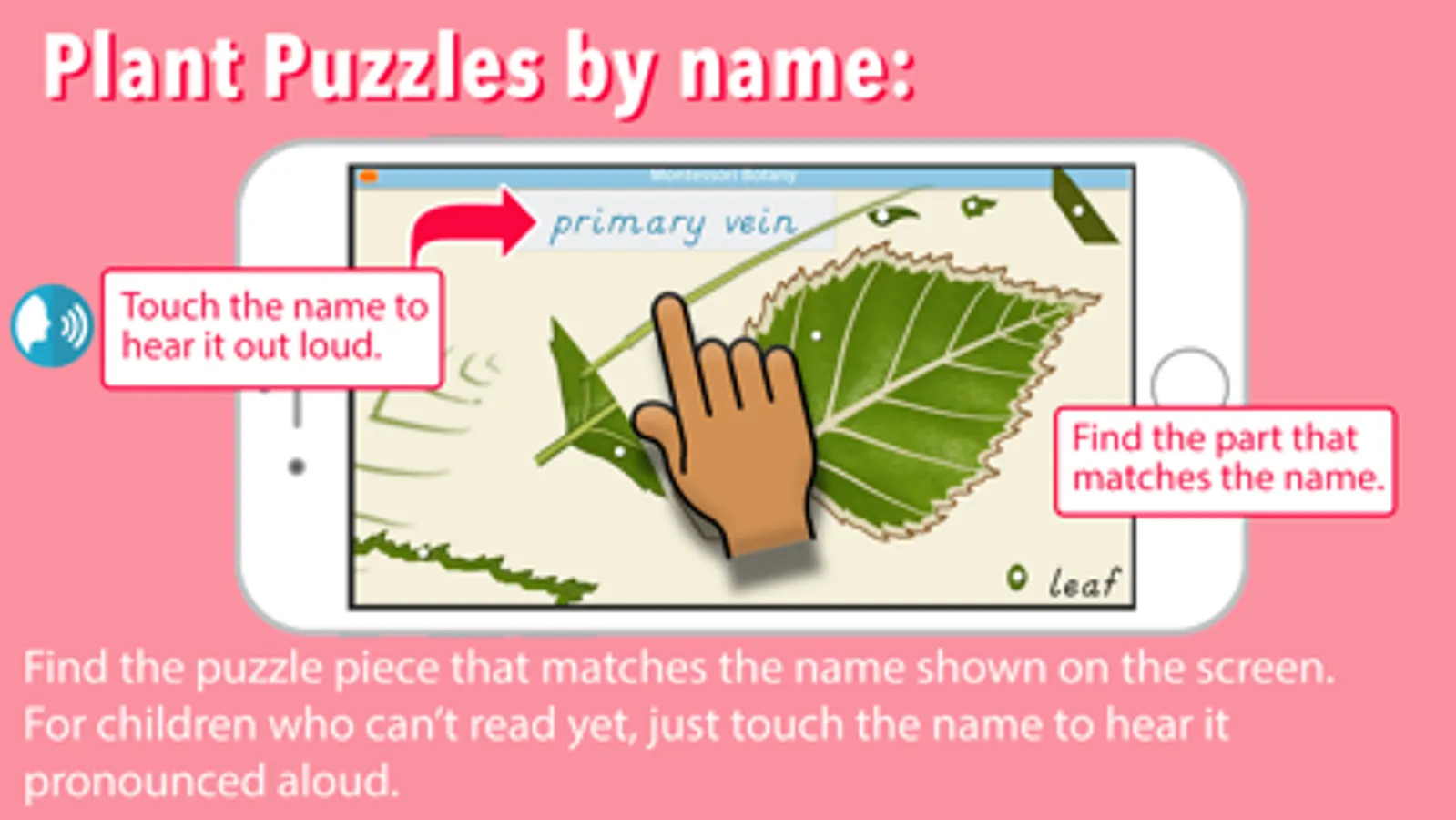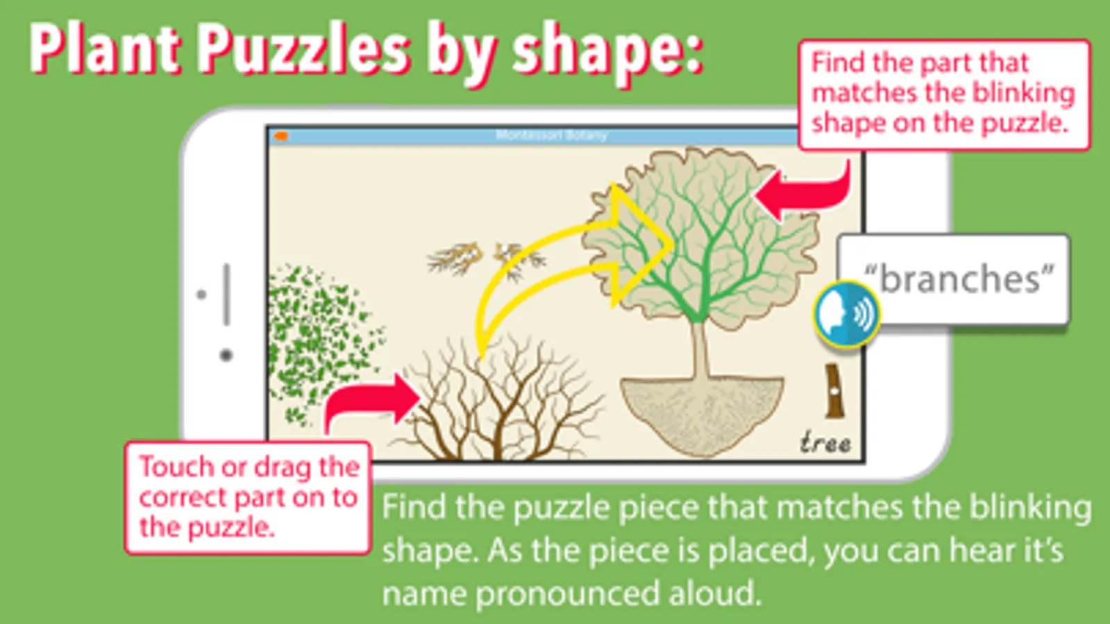 In the second plant puzzle lesson, children have to look for the plant puzzle piece that corresponds to the name shown at the top. For children who cannot read, the plant part name at the top can be touched to hear the name aloud for them to know which one to look for.