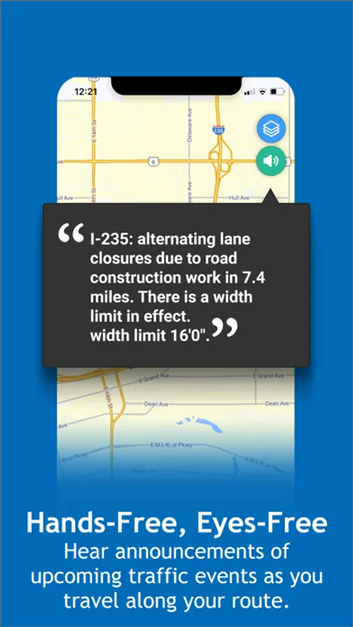 • Hands-free, eyes-free audio announcements of upcoming traffic events as you travel along your route