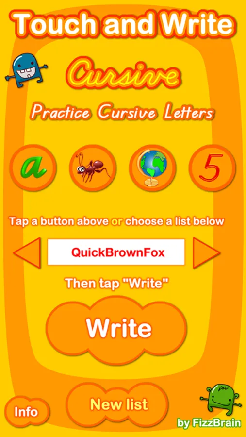 Kids love learning to write cursive - especially when they can use shaving cream, paint, and jello! "Cursive Touch and Write" was developed by teachers, and recreates the fun and effective teaching strategy used in classrooms every day: learning writing with shaving cream, jello, finger paint, and more! Practice single letters in "Single Letter Mode" for more support, then switch to "Whole Word Mode" to write entire words with connected letters! (Note: "Whole Word Mode" is only available for the iPad version.) "Cursive Touch and Write" allows you easily to create your own lists of children's names, spelling lists and favorite words so that you can individualize the learning experience!