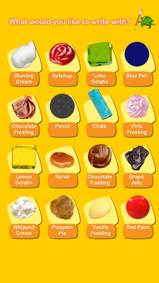 ‣Comes with 18 different writing textures: shaving cream, ketchup, lime gelatin, chocolate frosting, chalk, pencil, blue pen, lemon gelatin, chocolate pudding, syrup, grape jelly, whipped cream, pumpkin pie, red paint, and vanilla pudding! iPhone/iPod Touch version comes with 16 textures.