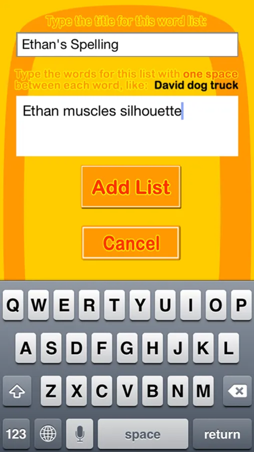 ‣Comes with the following word lists: ABC Countries of the World (and 1 City), 50 States, The Quick Brown Fox Jumps Over the Lazy Dog, ABC Words, Palindromes, Alphabet Letters, Numbers – and of course you may add as many of your own lists as you like!